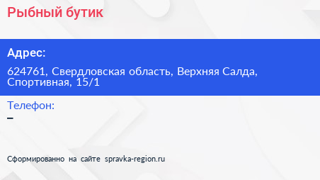 Рыбный бутик по адресу 624761, Свердловская область, Верхняя Салда, Спортивная, 15/1 в дальнейшем Организация, размещена в следующих категориях: