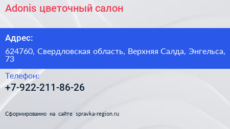 Adonis, цветочный салон по адресу 624760, Свердловская область, Верхняя Салда, Энгельса, 73 в дальнейшем Организация, размещена в следующих категориях: