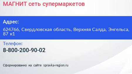 МАГНИТ, сеть супермаркетов по адресу 624766, Свердловская область, Верхняя Салда, Энгельса, 87 к1 в дальнейшем Организация, размещена в следующих категориях: