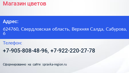 Магазин цветов по адресу 624760, Свердловская область, Верхняя Салда, Сабурова, 6 в дальнейшем Организация, размещена в следующих категориях: