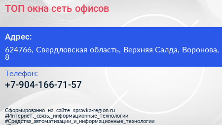 ТОП-окна, сеть офисов по адресу 624766, Свердловская область, Верхняя Салда, Воронова, 8 в дальнейшем Организация, размещена в следующих категориях: