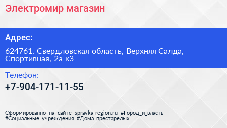 Электромир, магазин по адресу 624761, Свердловская область, Верхняя Салда, Спортивная, 2а к3 в дальнейшем Организация, размещена в следующих категориях: