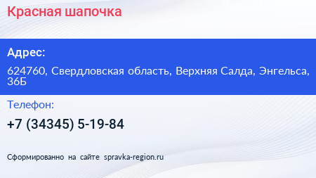 Красная шапочка по адресу 624760, Свердловская область, Верхняя Салда, Энгельса, 36Б в дальнейшем Организация, размещена в следующих категориях: