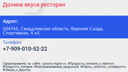 Долина вкуса, ресторан по адресу 624761, Свердловская область, Верхняя Салда, Спортивная, 4 к1 в дальнейшем Организация, размещена в следующих категориях: