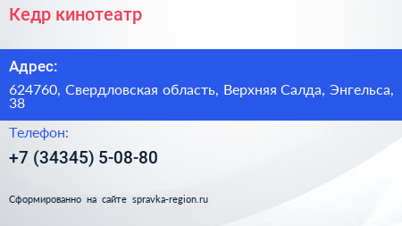 Кедр, кинотеатр по адресу 624760, Свердловская область, Верхняя Салда, Энгельса, 38 в дальнейшем Организация, размещена в следующих категориях: