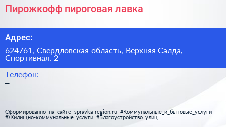 Пирожкофф, пироговая лавка по адресу 624761, Свердловская область, Верхняя Салда, Спортивная, 2 в дальнейшем Организация, размещена в следующих категориях: