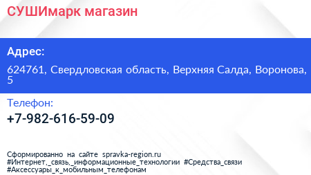 СУШИмарк, магазин по адресу 624761, Свердловская область, Верхняя Салда, Воронова, 5 в дальнейшем Организация, размещена в следующих категориях: