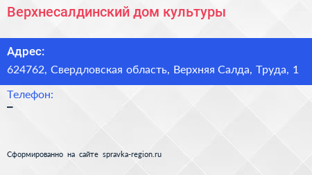 Верхнесалдинский дом культуры по адресу 624762, Свердловская область, Верхняя Салда, Труда, 1 в дальнейшем Организация, размещена в следующих категориях: