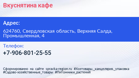 Вкуснятина, кафе по адресу 624760, Свердловская область, Верхняя Салда, Промышленная, 4 в дальнейшем Организация, размещена в следующих категориях: