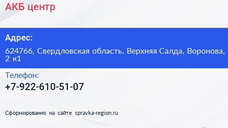 АКБ-центр по адресу 624766, Свердловская область, Верхняя Салда, Воронова, 2 к1 в дальнейшем Организация, размещена в следующих категориях: