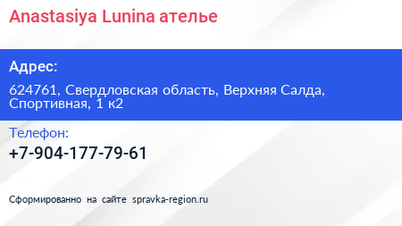 Anastasiya Lunina, ателье по адресу 624761, Свердловская область, Верхняя Салда, Спортивная, 1 к2 в дальнейшем Организация, размещена в следующих категориях: