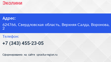 Эколини по адресу 624766, Свердловская область, Верхняя Салда, Воронова, 2 в дальнейшем Организация, размещена в следующих категориях: