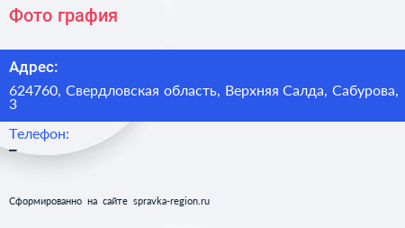 Фото-графия по адресу 624760, Свердловская область, Верхняя Салда, Сабурова, 3 в дальнейшем Организация, размещена в следующих категориях: