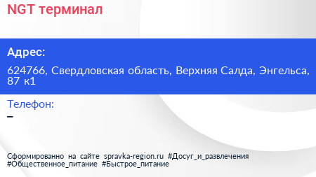 NGT, терминал по адресу 624766, Свердловская область, Верхняя Салда, Энгельса, 87 к1 в дальнейшем Организация, размещена в следующих категориях:
