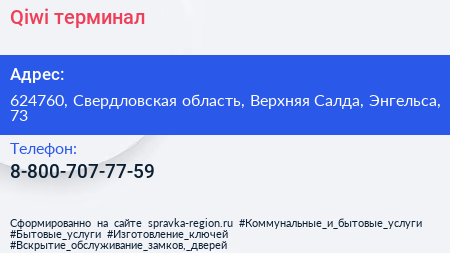 Qiwi, терминал по адресу 624760, Свердловская область, Верхняя Салда, Энгельса, 73 в дальнейшем Организация, размещена в следующих категориях: