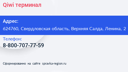 Qiwi, терминал по адресу 624760, Свердловская область, Верхняя Салда, Ленина, 2 в дальнейшем Организация, размещена в следующих категориях: