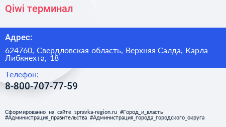 Qiwi, терминал по адресу 624760, Свердловская область, Верхняя Салда, Карла Либкнехта, 18 в дальнейшем Организация, размещена в следующих категориях: