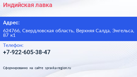 Индийская лавка по адресу 624766, Свердловская область, Верхняя Салда, Энгельса, 87 к1 в дальнейшем Организация, размещена в следующих категориях: