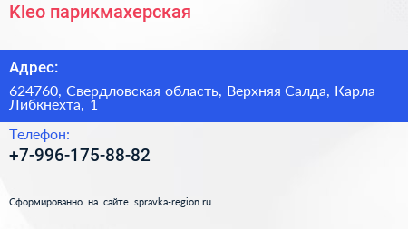 Kleo, парикмахерская по адресу 624760, Свердловская область, Верхняя Салда, Карла Либкнехта, 1 в дальнейшем Организация, размещена в следующих категориях:
