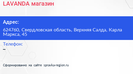 LAVANDA, магазин по адресу 624760, Свердловская область, Верхняя Салда, Карла Маркса, 45 в дальнейшем Организация, размещена в следующих категориях: