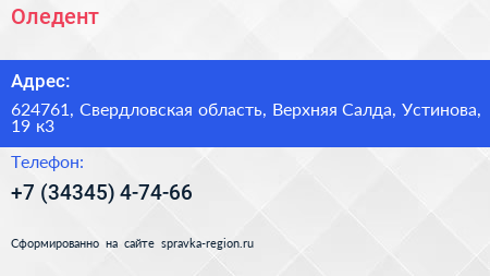 Оледент по адресу 624761, Свердловская область, Верхняя Салда, Устинова, 19 к3 в дальнейшем Организация, размещена в следующих категориях: