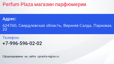 Perfum Plaza, магазин парфюмерии по адресу 624760, Свердловская область, Верхняя Салда, Парковая, 22 в дальнейшем Организация, размещена в следующих категориях: