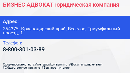 БИЗНЕС-АДВОКАТ, юридическая компания по адресу 354375, Краснодарский край, Веселое, Триумфальный проезд, 1 в дальнейшем Организация, размещена в следующих категориях: