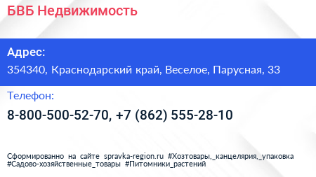 БВБ Недвижимость по адресу 354340, Краснодарский край, Веселое, Парусная, 33 в дальнейшем Организация, размещена в следующих категориях: