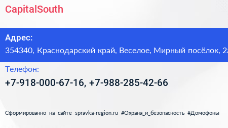 CapitalSouth по адресу 354340, Краснодарский край, Веселое, Мирный посёлок, 2а в дальнейшем Организация, размещена в следующих категориях: