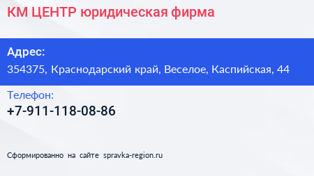 КМ-ЦЕНТР, юридическая фирма по адресу 354375, Краснодарский край, Веселое, Каспийская, 44 в дальнейшем Организация, размещена в следующих категориях: