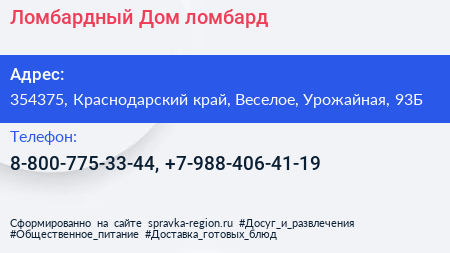 Ломбардный Дом, ломбард по адресу 354375, Краснодарский край, Веселое, Урожайная, 93Б в дальнейшем Организация, размещена в следующих категориях:
