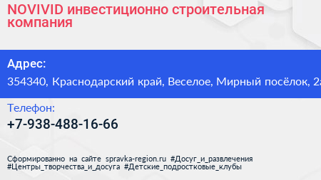 NOVIVID, инвестиционно-строительная компания по адресу 354340, Краснодарский край, Веселое, Мирный посёлок, 2а в дальнейшем Организация, размещена в следующих категориях:
