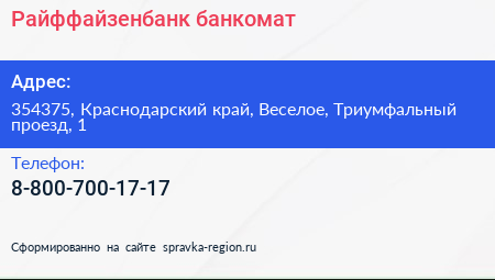 Райффайзенбанк, банкомат по адресу 354375, Краснодарский край, Веселое, Триумфальный проезд, 1 в дальнейшем Организация, размещена в следующих категориях: