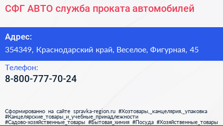 СФГ АВТО, служба проката автомобилей по адресу 354349, Краснодарский край, Веселое, Фигурная, 45 в дальнейшем Организация, размещена в следующих категориях: