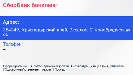 СберБанк, банкомат по адресу 354349, Краснодарский край, Веселое, Старообрядческая, 66 в дальнейшем Организация, размещена в следующих категориях: