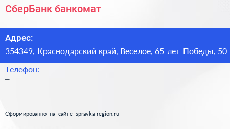 СберБанк, банкомат по адресу 354349, Краснодарский край, Веселое, 65 лет Победы, 50 в дальнейшем Организация, размещена в следующих категориях:
