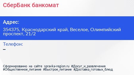 СберБанк, банкомат по адресу 354375, Краснодарский край, Веселое, Олимпийский проспект, 21/2 в дальнейшем Организация, размещена в следующих категориях: