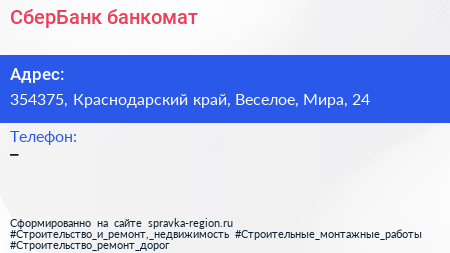 СберБанк, банкомат по адресу 354375, Краснодарский край, Веселое, Мира, 24 в дальнейшем Организация, размещена в следующих категориях: