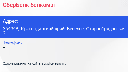 СберБанк, банкомат по адресу 354349, Краснодарский край, Веселое, Старообрядческая, 2 в дальнейшем Организация, размещена в следующих категориях:
