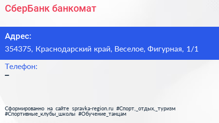 СберБанк, банкомат по адресу 354375, Краснодарский край, Веселое, Фигурная, 1/1 в дальнейшем Организация, размещена в следующих категориях: