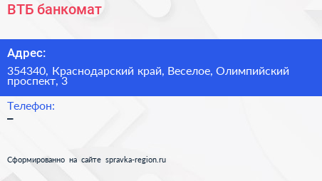 ВТБ, банкомат по адресу 354340, Краснодарский край, Веселое, Олимпийский проспект, 3 в дальнейшем Организация, размещена в следующих категориях: