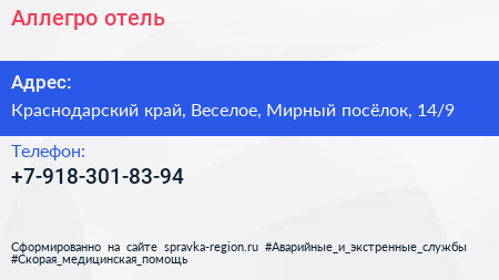 Аллегро, отель по адресу Краснодарский край, Веселое, Мирный посёлок, 14/9 в дальнейшем Организация, размещена в следующих категориях: