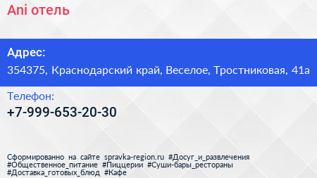 Ani, отель по адресу 354375, Краснодарский край, Веселое, Тростниковая, 41а в дальнейшем Организация, размещена в следующих категориях: