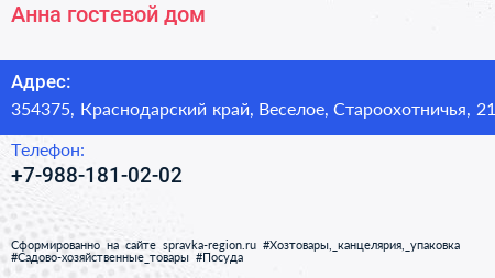 Анна, гостевой дом по адресу 354375, Краснодарский край, Веселое, Староохотничья, 21 в дальнейшем Организация, размещена в следующих категориях:
