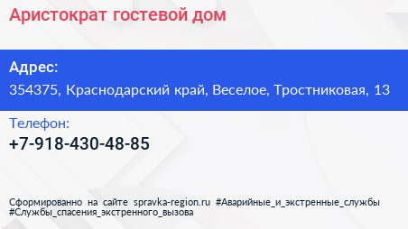 Аристократ, гостевой дом по адресу 354375, Краснодарский край, Веселое, Тростниковая, 13 в дальнейшем Организация, размещена в следующих категориях: