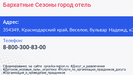 Бархатные Сезоны, город-отель по адресу 354349, Краснодарский край, Веселое, бульвар Надежд, к3 в дальнейшем Организация, размещена в следующих категориях: