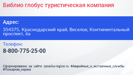 Библио-глобус, туристическая компания по адресу 354375, Краснодарский край, Веселое, Континентальный проспект, 6а в дальнейшем Организация, размещена в следующих категориях: