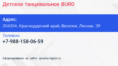 Детское танцевальное BURO по адресу 354354, Краснодарский край, Веселое, Лесная, 39 в дальнейшем Организация, размещена в следующих категориях: