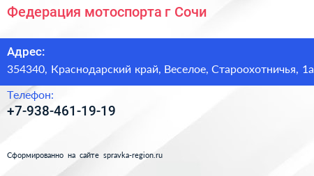 Федерация мотоспорта г. Сочи по адресу 354340, Краснодарский край, Веселое, Староохотничья, 1а в дальнейшем Организация, размещена в следующих категориях: