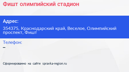 Фишт, олимпийский стадион по адресу 354375, Краснодарский край, Веселое, Олимпийский проспект, Фишт в дальнейшем Организация, размещена в следующих категориях:
